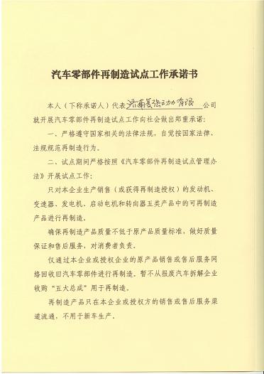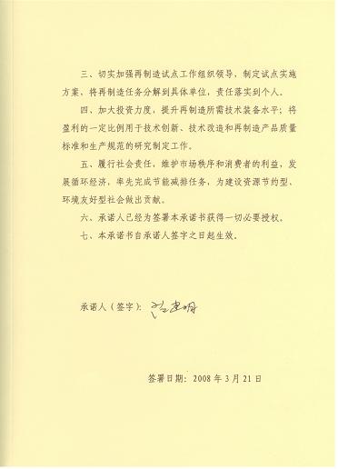 试点企业签署并宣读了《汽车零部件再制造试点工作承诺书》,向社会郑重承诺在做好再制造试点工作的同时,履行社会责任,维护市场秩序和消费者的利益,发展循环经济,率先完成节能减排任务,为建设资源节约型、环境友好型社会做出贡献。