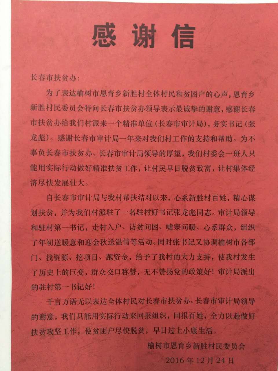 1月 3日,窗外虽是冰天雪地,长春市扶贫办屋内暖意浓浓。榆树市恩育乡新胜村村书记、村妇女主任及贫困户代表贯老汉3人一早就来到了市扶贫办,送来了感谢信。