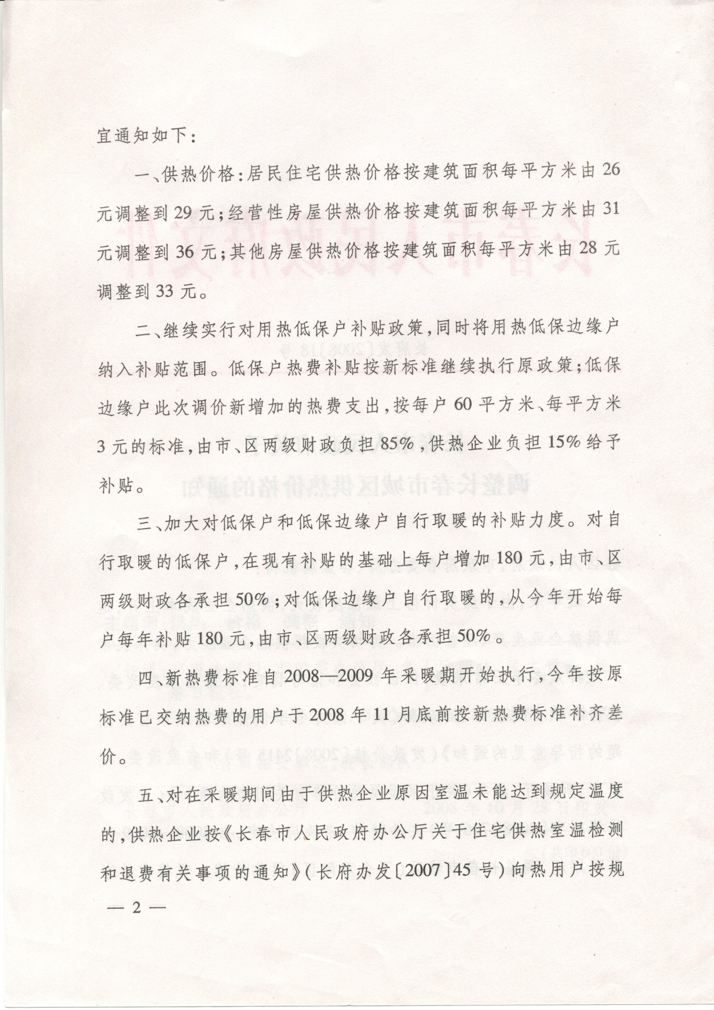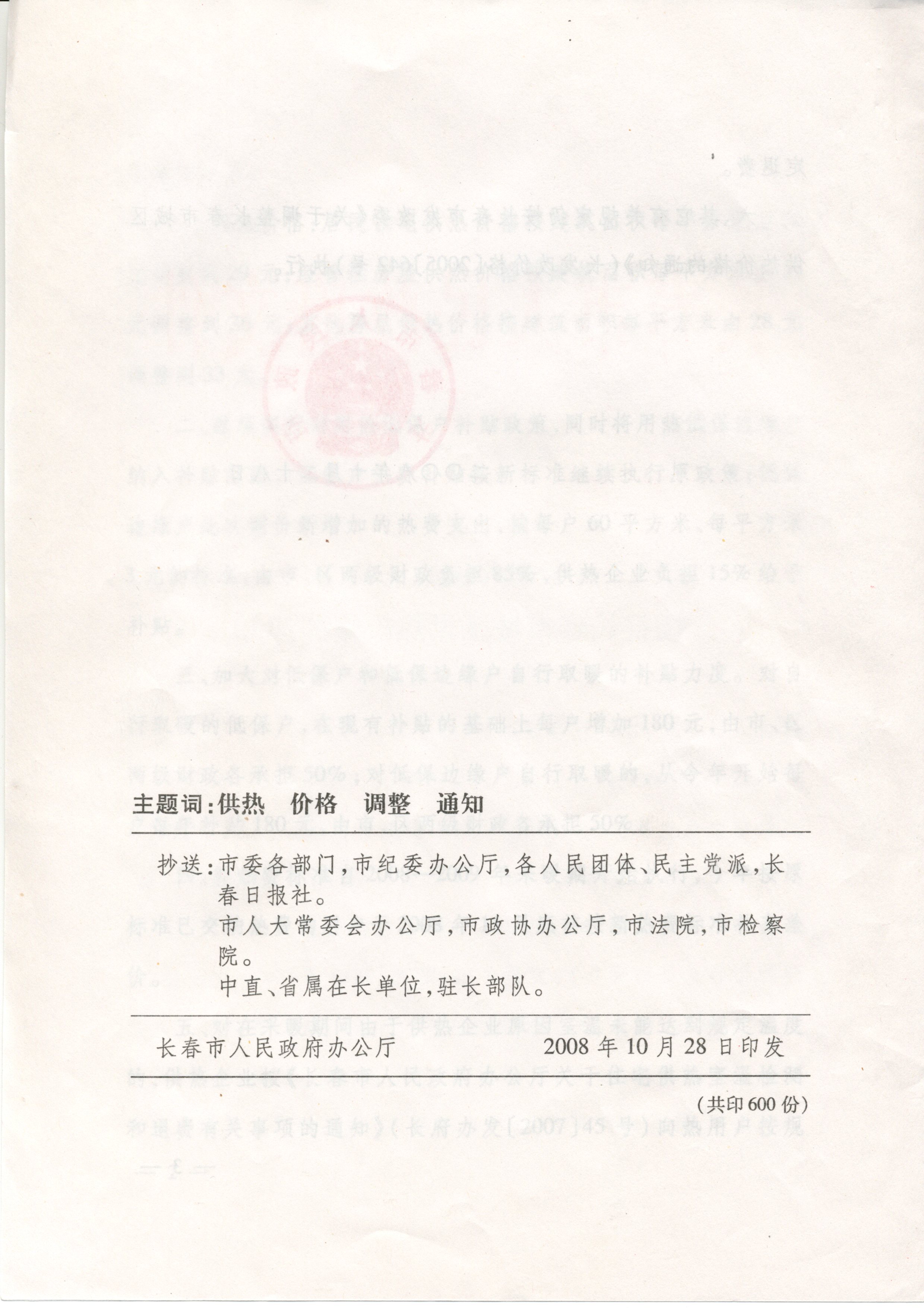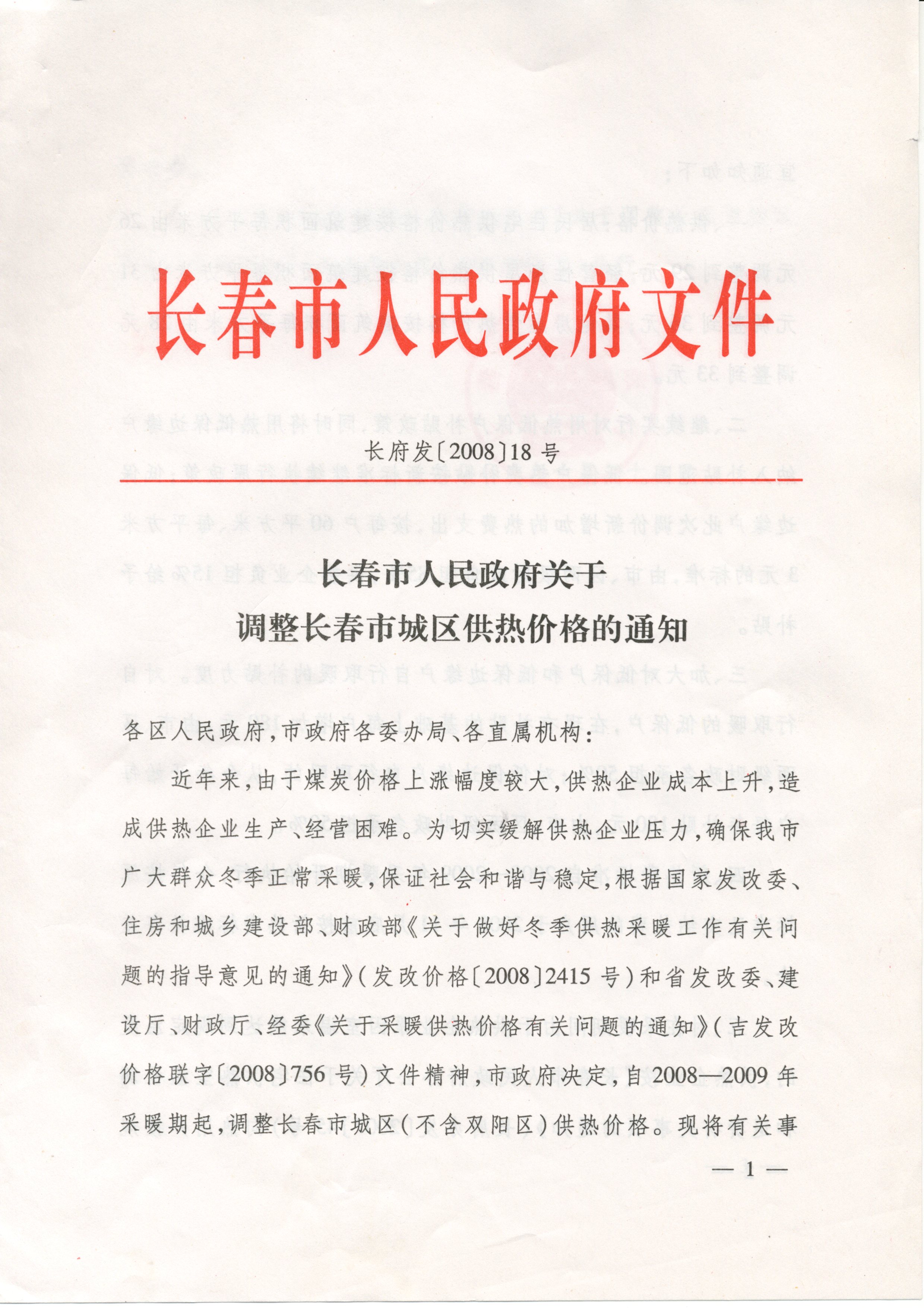 关于调整长春市城区供热价格的通知(长府发【2008】18号)