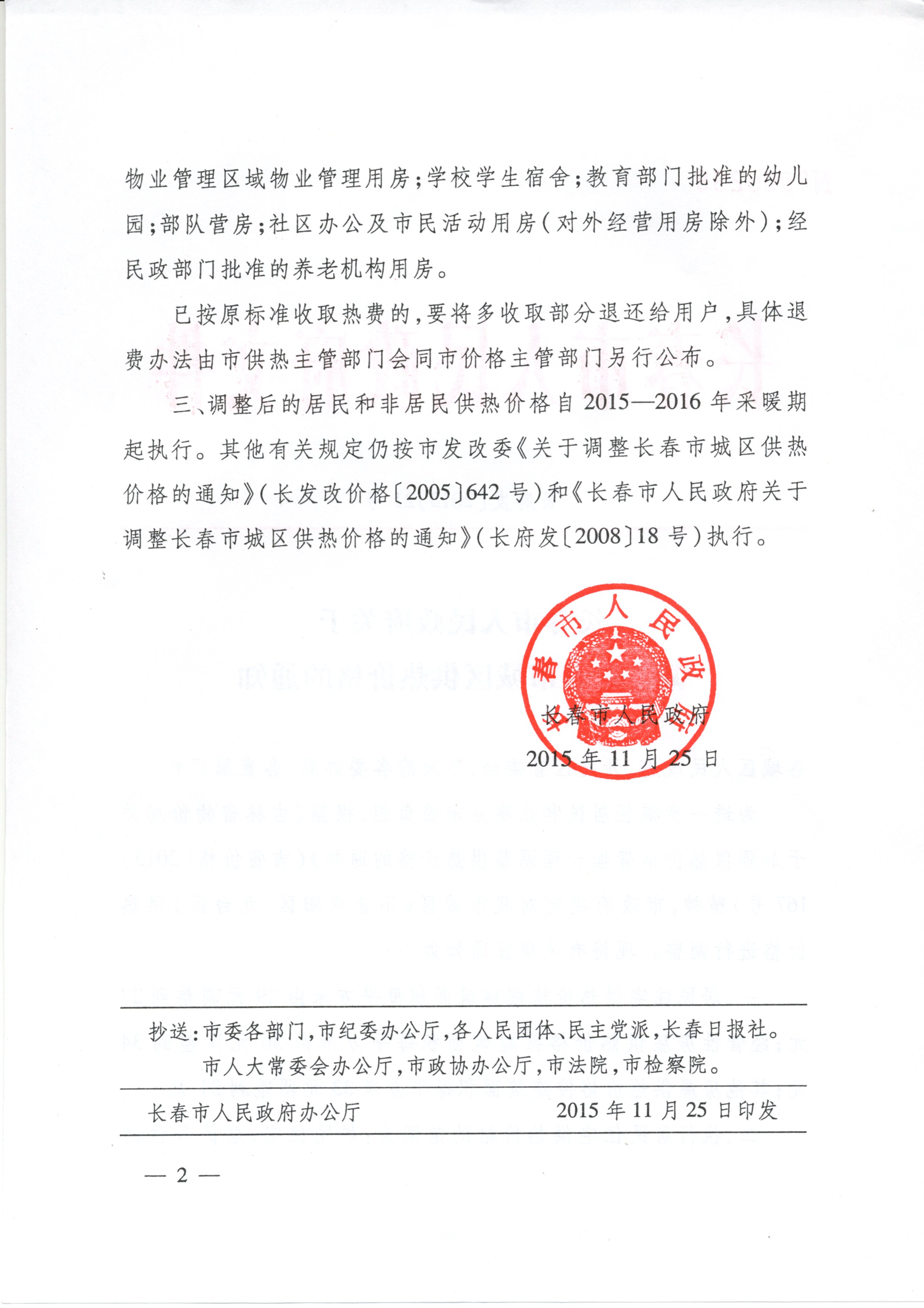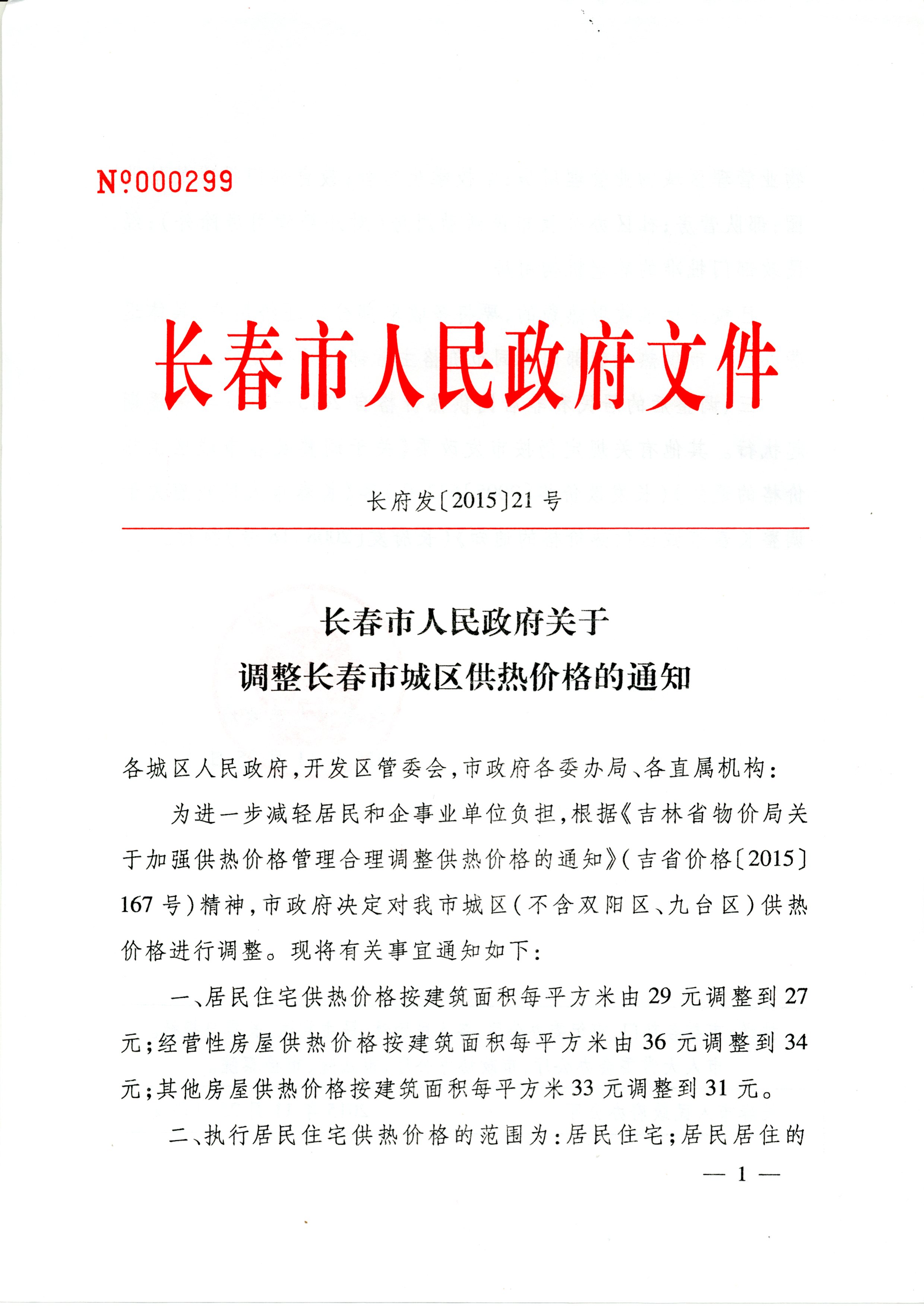 关于调整长春市城区供热价格的通知(长府发【2015】21号)