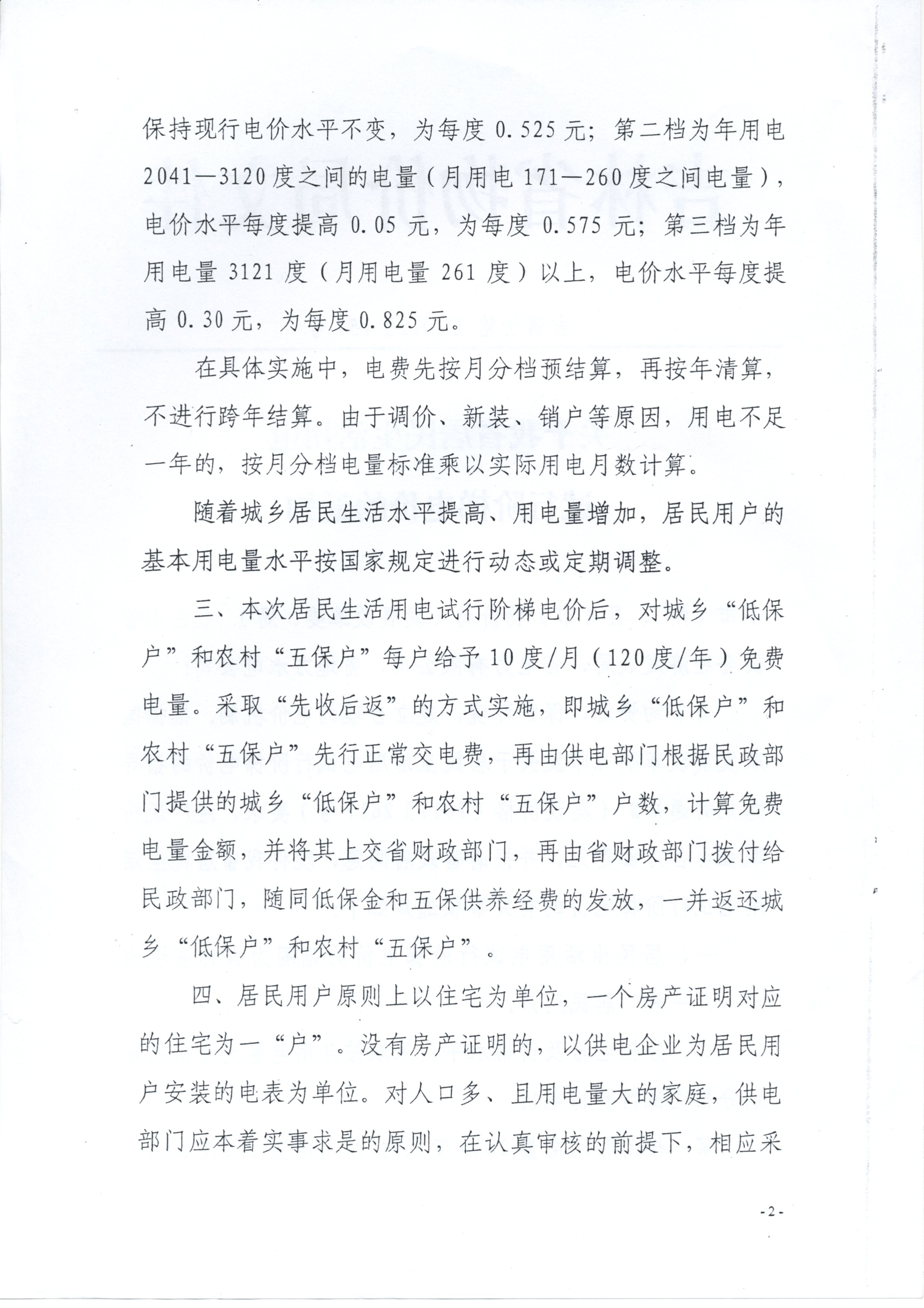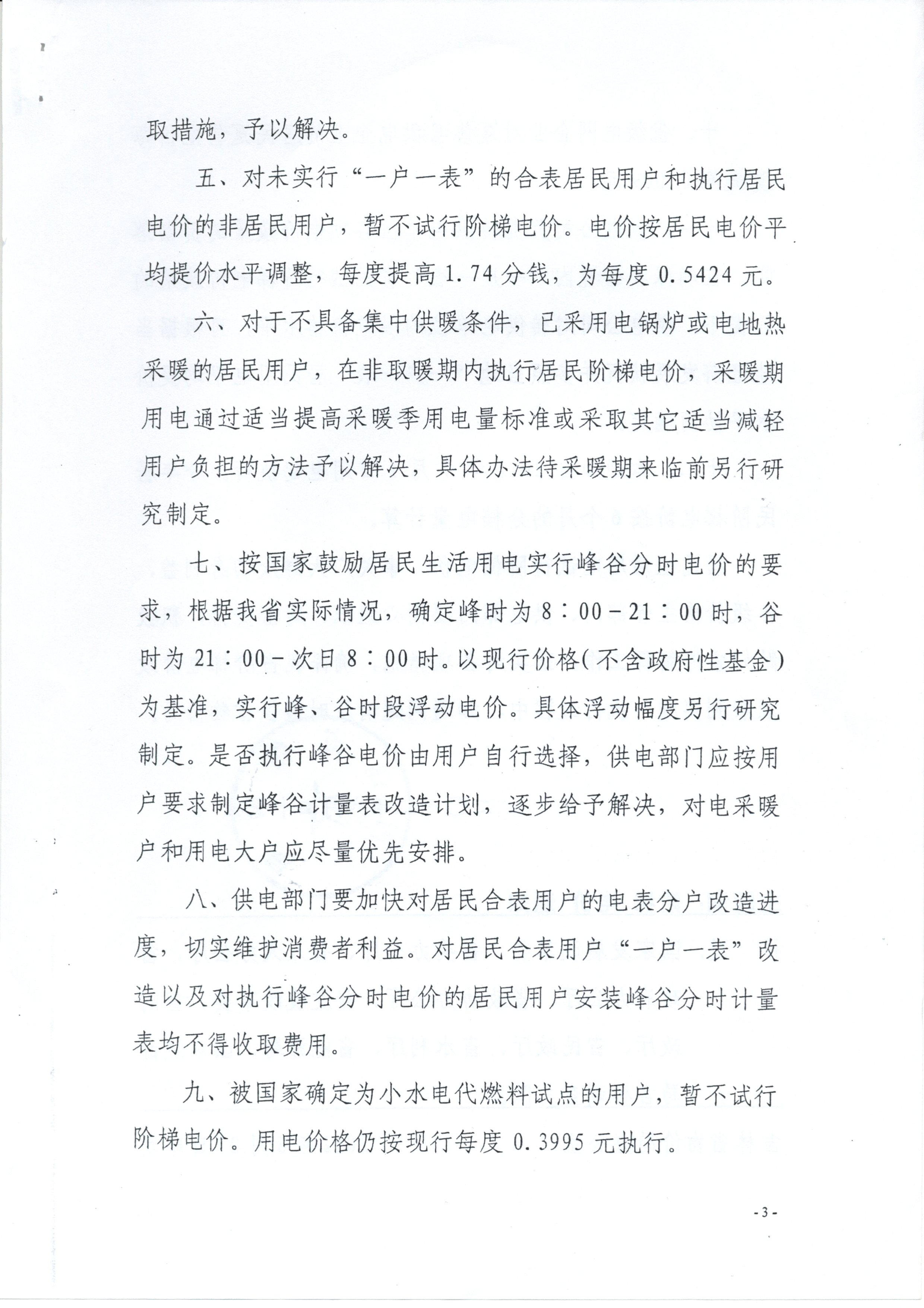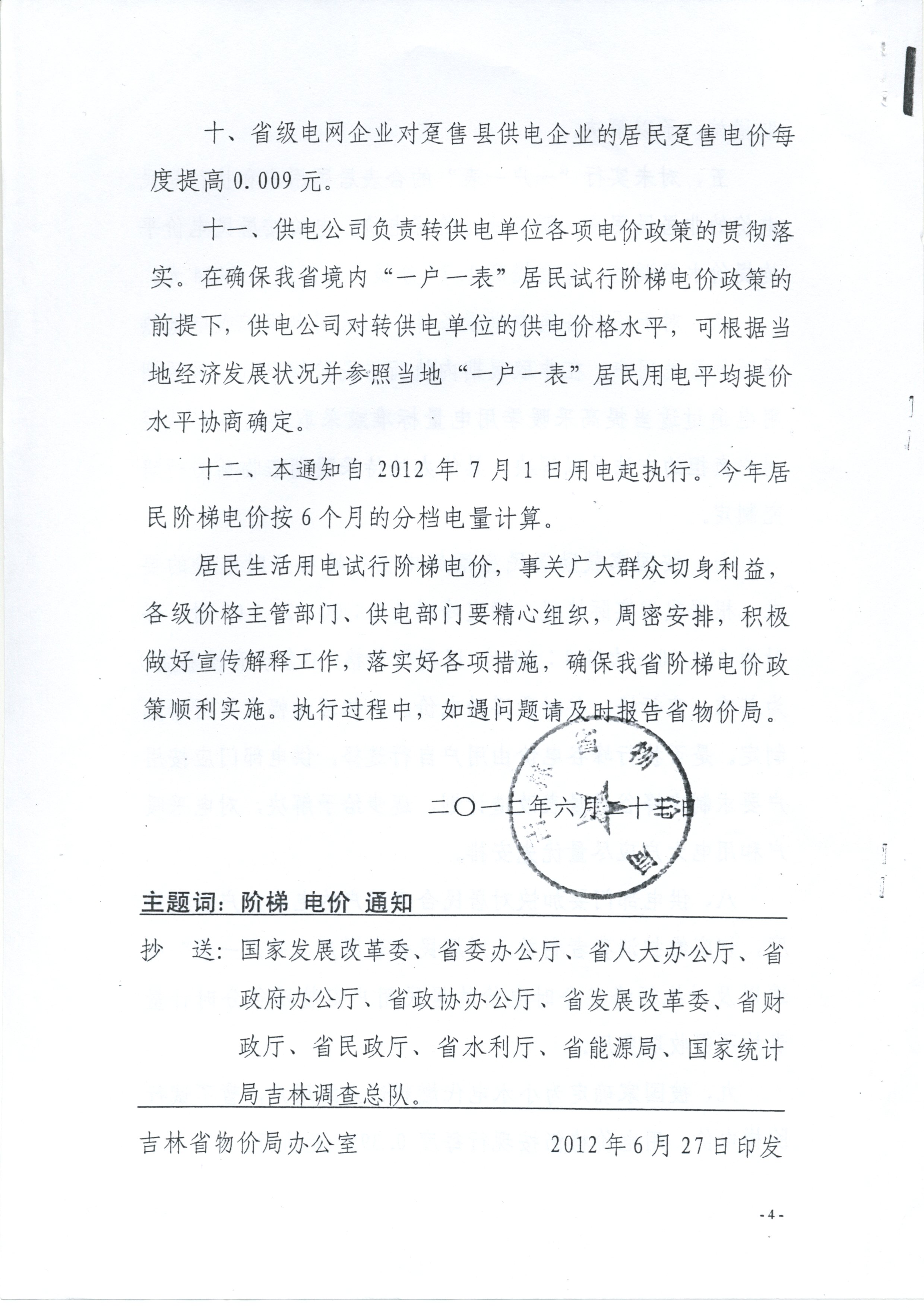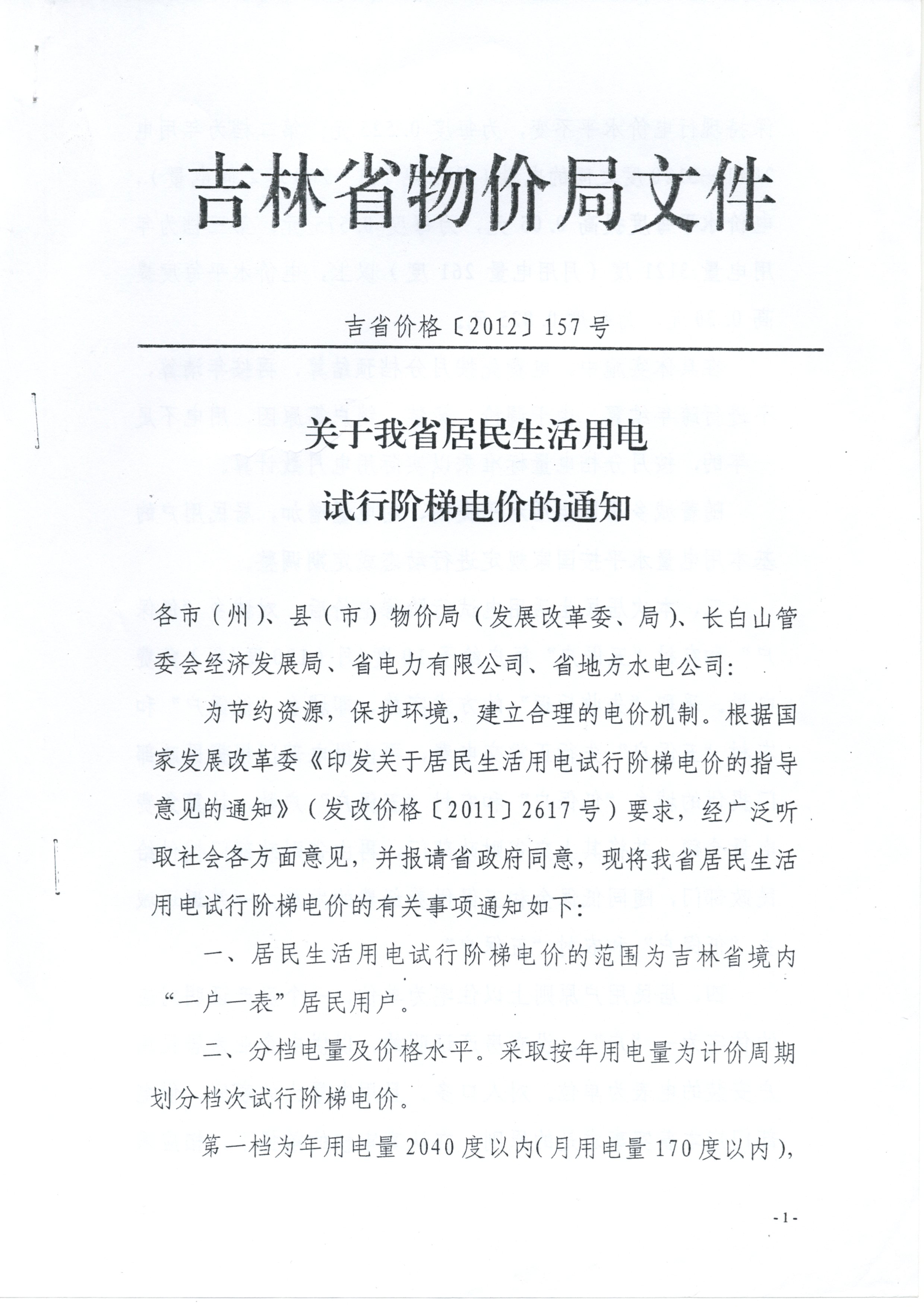 关于我省居民生活用电试行阶梯电价的通知(吉省价格【2012】157号)