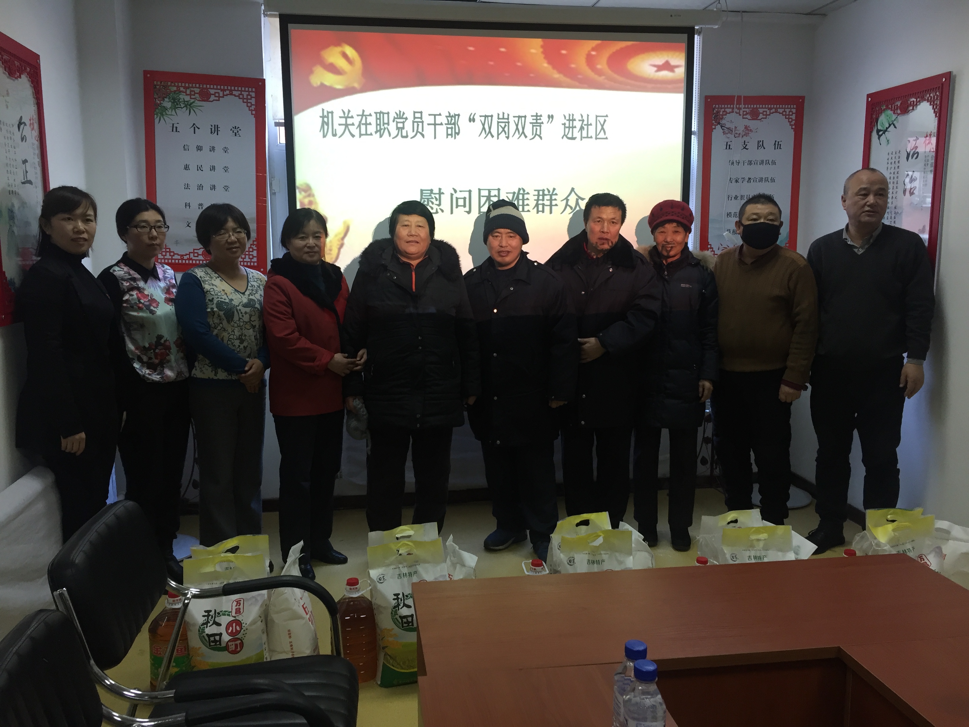 党员孙百通同志在吉林街道办事处周晓巍主任、常萃茹副主任等人的陪同下,走进二道区临河街办事处万科社区,组织召开了杨清云等五低保户等参加的座谈会,了解部分低保户需求,帮助解决部分实际困难,同时带去春节的祝福和米面油等生活用品。
