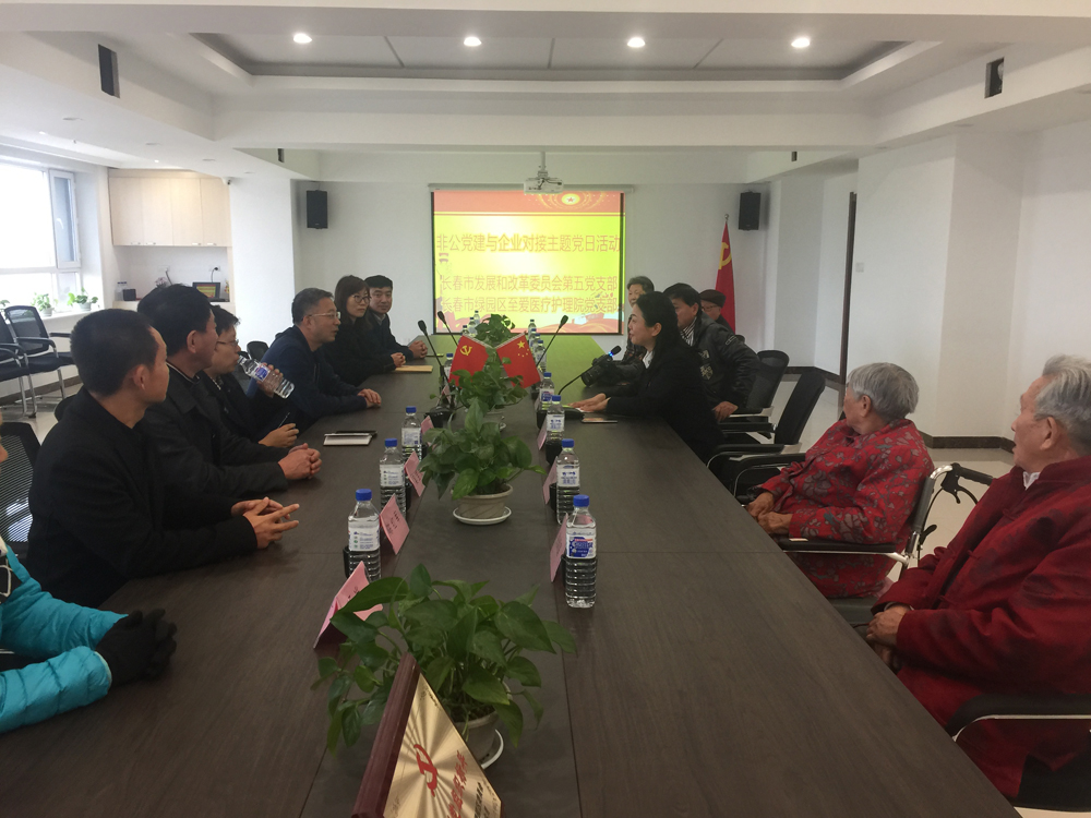 10月26日下午,市发改委王雷副主任带领机关第五党支部党员,走进绿园区至爱老年医疗护理院,开展“与非公企业对接帮扶支部主题党日活动”,为护理院老人倾情献唱歌曲,并现场联合召开支部党员大会进行交流学习。