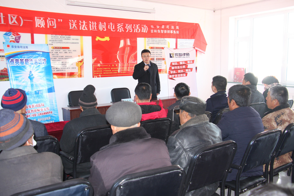 阅读次数:    来源:长春市发改委    日期:2018-11-23 15:45:00    【打印此页】    【关闭】    字号:【大 中 小】为全面贯彻落实党的十九大精神,进一步加强农村法制宣传教育工作,增强广大农村基层干部群众的法制观念,扎实开展法制扶贫工作,推进我市基层民主政治建设,维护农村和谐稳定,2018年11月22日上午由长春市发改委牵头,长春市法律援助中心和吉林良智律师事务所主办在农安县巴吉垒镇上河湾村开展了“贯彻落实十九大精神,扶贫攻坚法律先行‘一村(社区)一顾问’送法进村屯”活动。