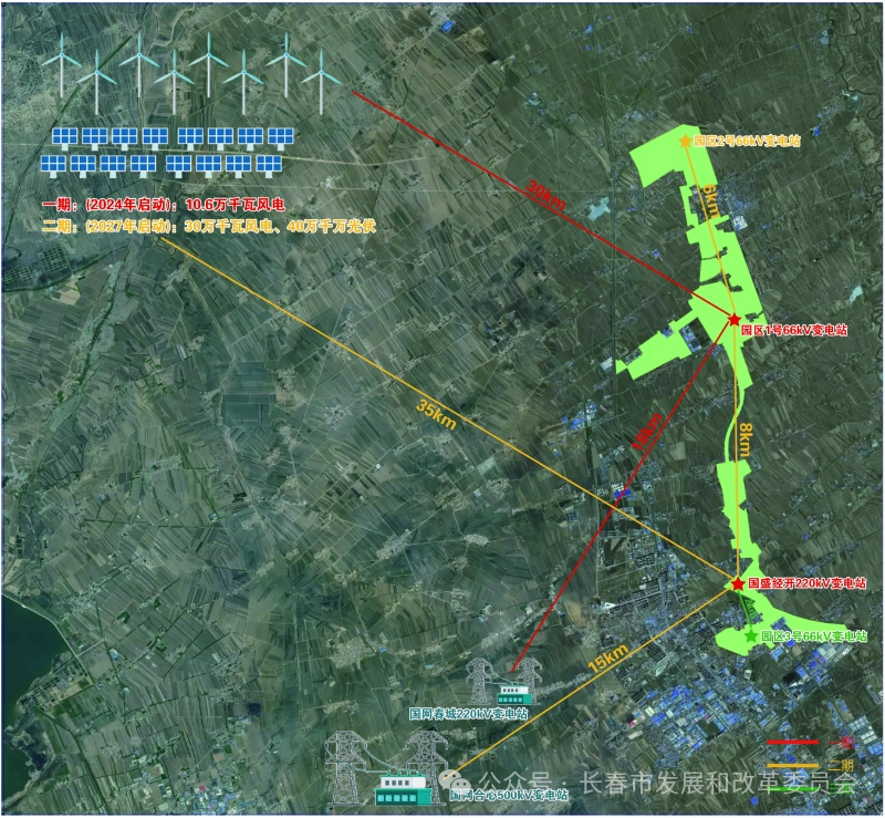 项目由农安国盛电力供应有限公司投资建设,总投资约50亿元,建设周期为2024–2030年,规划建设220kV变电站1座、66kV变电站3座、配套新能源装机800MW(风电400MW、光伏400MW)及储能80MW/320MWh。